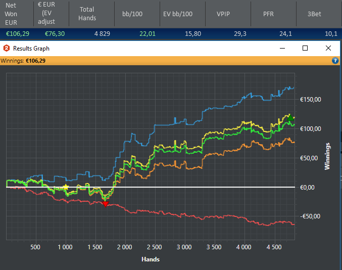 В общем, минут 10 сидели толкались на 50бб стэке, думаем, бля, надо добить хотя бы до 30$ и пойти бласт 30$ затащить и спать.