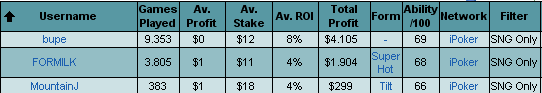Удачи. Не пались так с сильными руками. :) Если смотреть на игру регов 20 Ipoker, то только belra. а остальные так себе. И очень помогают раздачи от SmSL2010 реально постфлоп подтягивают против местных "регов" типа Dwakrule или Lamumia. Главное штоб диспа не насиловала. Все у тебя будет ЗЕР ГУТ!