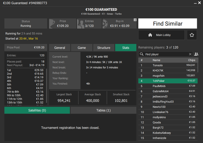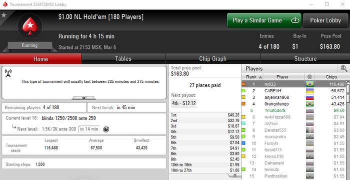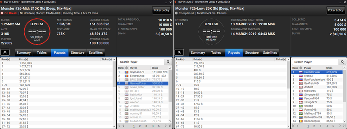 Решил тут замарафонить вместе с Урбановичем), покатать Монстер-серию на Пати, на пятый день случилось 2 финалки, в итоге бустанул БР и поправил статистику Патипокера на Шарке, бест-кэш в онлайн-МТТ!! Приятно-то как!!))