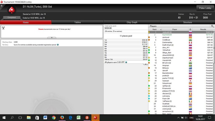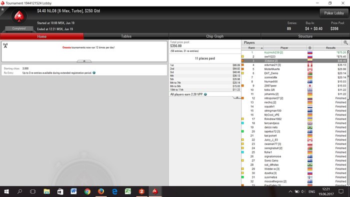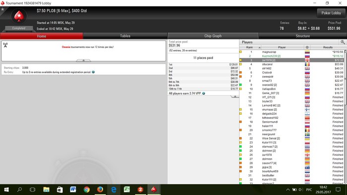 Сегодня утром продолжилась боль и борьба) Удалось зацепить турбик за 4$, но в остальном кошмар. Особенно больно вылетел из Омании, где за 4 переезда стек на финалку превратился в вылет на баббле.