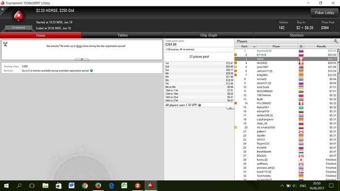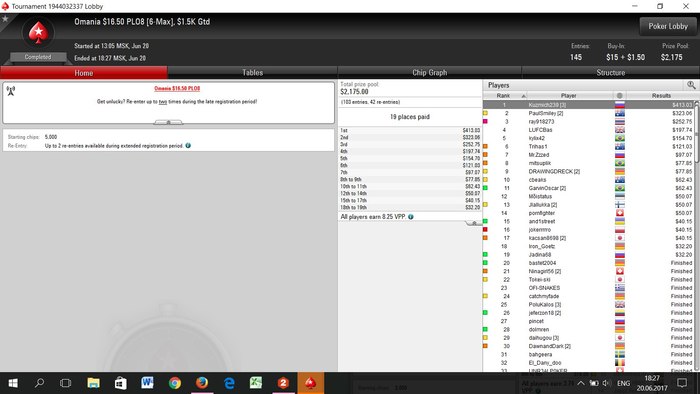 Сыграл на этой неделе лучшую и худшую сессии в этом году. Худшая была вчера и рассказывать особо нечего, ибо мы все знаем, как это бывает, а вот лучшая была довольно яркой. Впервые мне сдался утренний дип ребайник за 5$, в который я все вкидывал и вкидывал и вот наконец-то (теперь осталось дождаться гипернокаута с ре-энтри за 11$, где РОИ -100%, наверное). Вышел в ХА с ОРэйзиДэйзи (непонятный для меня игрок с откровенными ликами, но плюсовый), он отказался пилить и пришлось играть гипер ХА за 120 $, который он сыграл откровенно слабо. Дальше продолжилась стандартная игра последних недель, но настроение мне уже было не испортить и после обеда с 3его входа удалось немного раскрутиться в Омании ПЛО 16.5. На предфиналке за мной сел неадекватный бразил, которому невероятно заходило и только какой-то супердерзкий блеф спас меня от вылета на этой стадии. В итоге на финалку вышел самым коротким, но и это было уже очень приятно. Играл спокойно и в итоге удалось удвоить свой короткий стек до 100к, что было средним показателем для всех, кроме чипа с 500К. В итоге он уверенно подъел всех кроме меня и мы остались в ХА 1 к 10. Он написал в чате, что я норм парень и если удвоюсь, то он готов попилить, но почему-то этого не произошло даже после моего утроения. Это был 100% лучший ХА в моей жизни, потому что большинство раздач я выигрывал без вскрытия, а соперник в чате параллельно учил меня играть и называл "земляным червяком". В итоге при уже легком моем перевесе в фишках затащил 58 на 42, за что старзам спасибо, и оформил чистую победу. ЗЫ_ Побольше бы таких дней: