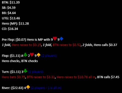Ты хочешь намекнуть что ты тут фолдить собрался? A2, A3, иногда АК так может сыграть+ какие то рандомные полублефы от рук типа , . 45s наверняка поставят флоп. Статы кроме VPIP PFR можешь не выкладывать когда на оппа 60 рук. Фолда нету. Ты поймал идеальный флоп и собираешься фолдить второй сет, подозревая что там АА? Смысл тогда твоего захода под 3бет? Что бы увидеть флоп без оверкарт (что будет крайне редко) и надеятся что там АК?