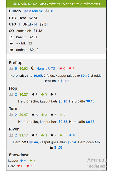Ребят, ещё одна интересная раздача. 3 бет банк. В планах было разыграть только 2 улицы, но из-за попадания в даму решил на ривере сам доисполнить. Посмотрите, насколько плохое решение по риверу. По сути сначала пытался пушом добрать со всех вторых пар которые, колят 2 улицы, но потом понял что по сути здесь против таких комбинаций только чек, т.к. им нет смысла ставить ривер( есть шд велью). С другой стороны если опп слабый придумал у него в коле на ривере только KQ и Qs(если поехал бэкдор по терну), и это наверное единственные руки которые мы бы могли играть чек кол ривера( опять же повторюсь если опп слабый). Как часто$0.02/$0.05Zoom No Limit Holdem