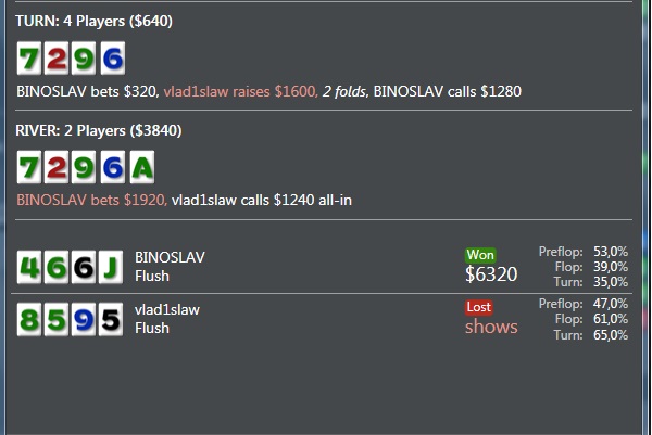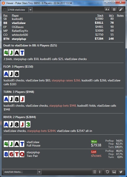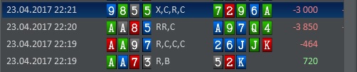 Какая-то странная вчера сессия выдалась, начиналось все под девиз: "Доминируй, властвуй, унижай", а потом я как хапнул несколько баббл аутов и наверное слегка поплыл и опечалился, но тем не менее из 12 турниров 4 в итм, что правда не позволило вывести сессию в плюс, остался в маленьком минусе