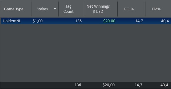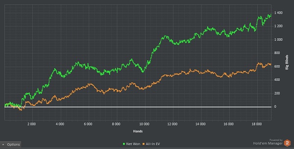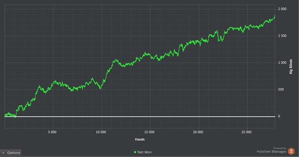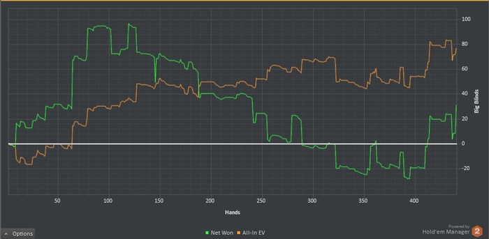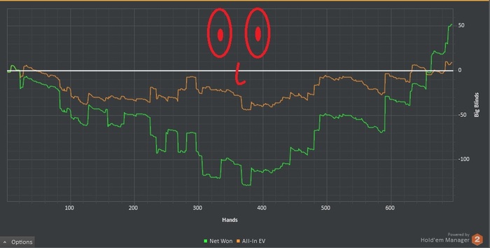 Иногда бывают такие сессии, когда ты по началу знаешь что играешь правильно и ты должен тащить, а тем временем ЕВ болтается около ноля, а профит падает в бездну и когда это затягивается в голову начинают приходить всякие дурные мысли. Например: ты уже не знаешь что сыграл правильно, а вместо этого просто думаешь правильно ли я сыграл, ещё приходят такие мысли как "мой ли это вид", может попробовать спины, омаху и т.д. и ещё одна самая дурацкая мысль, а не изменить ли мне стратегию.....сегодня я поборол все дурные мысли во время их зачатия и дисперсия мне начала улыбаться.