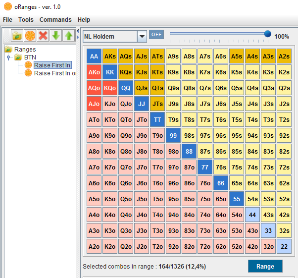 1. Несколько напрягает, что окно конструктора поверх абсолютно всех других окон. Хотелось бы его не закрывать каждый раз, а просто сворачивать. 2. Сплитованный ренж из конструктора можно переместить в основное окно программы только в виде папки с суб-ренжами. Нельзя ли еще иметь возможность выбирать целый ренж как это можно делать в power-equilabe, pokerrangere и т.п.?