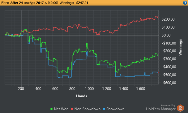 Давно ведется работа над красной, но результатов конкретно по ней пока нету. Смотрела раздачи рега, который плюсует люто по красной, так у него даже сайзинга 1\3 нету, он тупо прохуяривает 60% 75%-150% 75%-allin. Любые руки, любые борды. А я пытался выбирать какие-то лучшие ситуации, всегда все просчитать и быть точно уверенным. Сейчас мне кажется когда пытаешься перестроить так игру, то как раз много ситуаций и будет незнакомых и придется действовать не будучи уверенным в действиях. Короче я подготовился, сел играть и меня начали жестко ушатывать, сам сразу же тильтанул и замазался.
