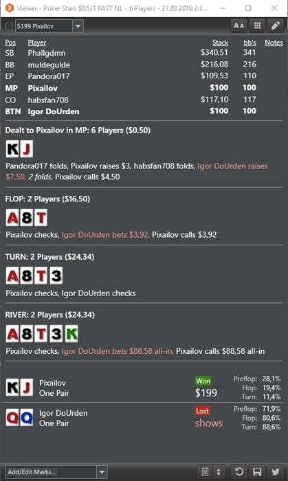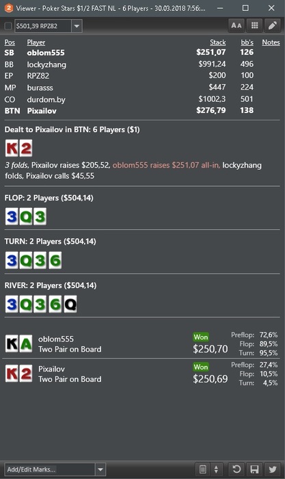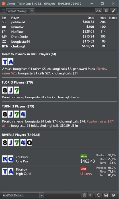 не был на 200 уже около 10ти дней, тк схавал прилично. И не сказать что была одна грязь, да ран был не лучший, но думаю я зарвался( в начале месяце ставил себе установу на бест оф зе бест, а в итоге будет ворст манс походу. Пересматривал свои руки на рег столах и пришел к выводу что на них я просто дичайше тильтую и левелюсь вообще нон-стоп почти в каждой сессии. Сейчас работаю над игрой и играю только зум, там я не позволяю себе подобной херни, и психоэмоциональное состояние гораздо лучше, возможно по причине неизвестности поляны .Еле сдерживаюсь от нытья, смотрю это самый популярный способ заурить на всем ДТ, но я понимаю что все дело в своих же до безумия частых и порой очень простых ошибках. Как-то уныло получилось высказаться. На самом деле настрой-бодрячком в конце месяца выложу отчетик)
