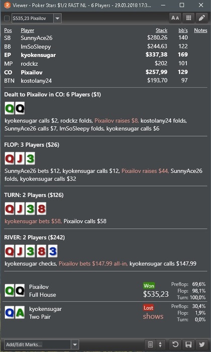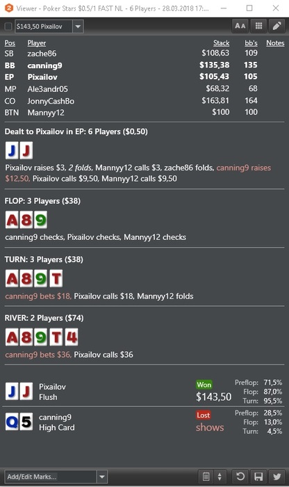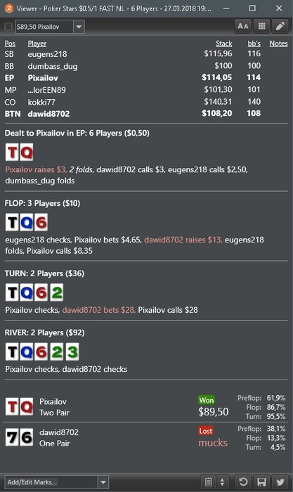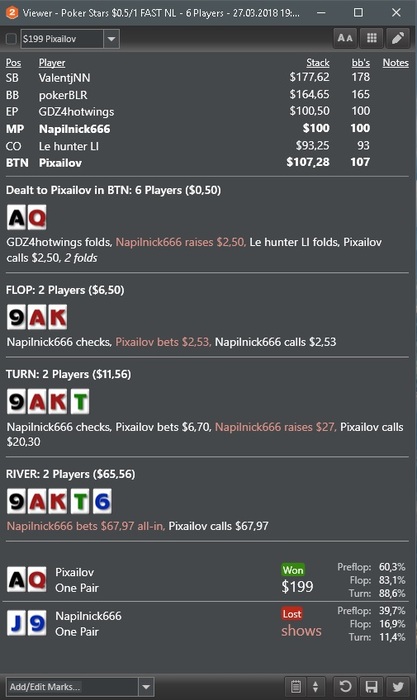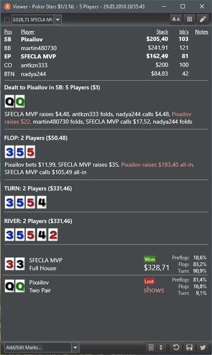 у этого хенда лучшие блокеры, правда поляне порой вообще пох на них. то есть я считаю что он к риверу должен выкидывать все до сета 77, а стритов у него нет тк у меня. Все конечно от частот зависит, я согласен порой с ними у меня не идеал, но рейзить тут КЖ бред. Со стритом я тут поставлю овербет вплоть до 2х банков.