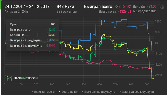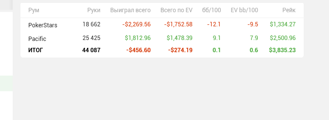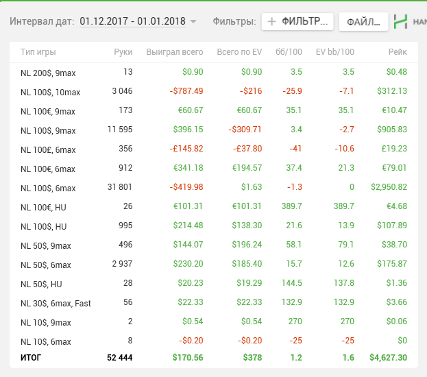 Завтра еду в Европу на НГ , напишу небольшой отчёт за этот месяц , 90%+ сыгранных рук отыграл на сотке , что не может не радовать , на старзах в этом месяце на чего не получалось выиграть , спас от минусового месяца второй рум , много экспериментировал , сегодня разбирал раздачи понял как и где я много теряю , после нового года на эти моменты буду особенно обращать внимания Результаты по румам