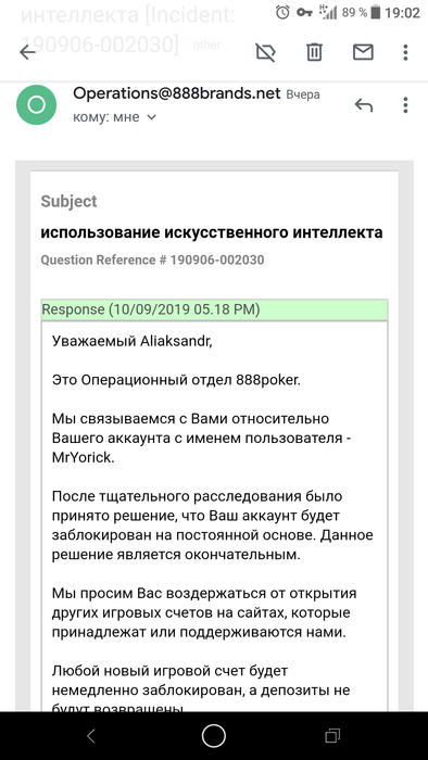 Когда старз ввел ограничение на 4 стола, запустил 888 посмотреть как там софт и количество игры. Пришло письмо что использую ИИ, ответил что они ошибаются, в итоге после тщательного расследования было принято решение, что аккаунт будет заблокирован на постоянной основе.