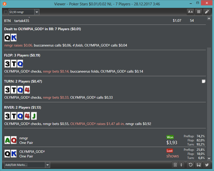 C21H23NO5, так да, писал же выше, что уже уставшим очень катал(нажал ситаут на бб к моменту раздачи) и не смог в логическую цепочку : ставит на ривере с AQ —> точно не стабильный рег(почему все употребляют слово рег, как синоним "человек делающий в покере деньги"?) —> не выкинет эти AQ. Вот не было бы ставки и он вколил бы мой пуш по риверу, тогда точно не ошибка, просто парень Хиро, в прочем и такой плей не считаю большой ошибкой, пытался выбить капнутый диапазон — не выбил, что поделать.