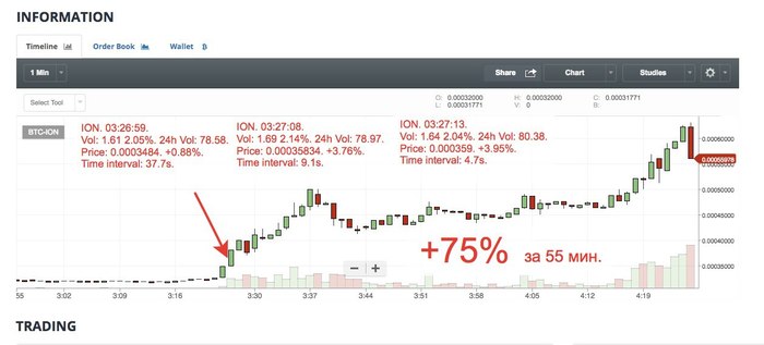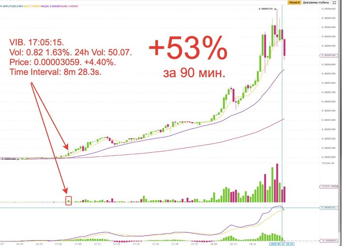 Примерно так выглядит памп. Орги потихоньку затаривают, а потом дают сигналы в платные группы.