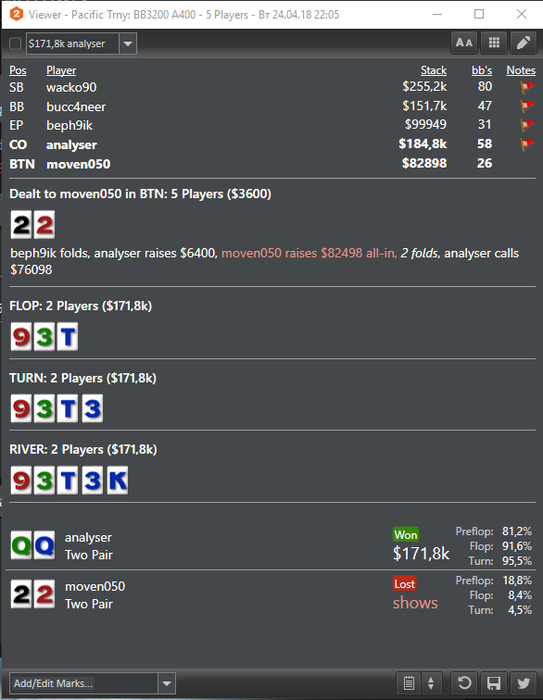 Ну что друзья, откатал первую сессию. Хочется сказать, что совсем отвык от миллионов лимпов и колов в баунти на 20бб с Посмотрел несколько раз, как залимпили АА, сложили пару раз по 100бб КК в АА. Ребята на этом аби играли настолько лузово, что я думал пересмотреть свой диапазон открышки))) В середине сессии хотел расплакаться,позвонить своему старому бекеру и со слезами на глазах вернуться на аби20 под бекинг В общем скатал -200$ за сессию, с банкроллом в 2к это кажется так много, а раньше -200$ это как по своим, даже не расстроился) Теперь определилась основная цель на ближайшие 3 месяца, а именно до лета. Хочу попробовать на этом аби сделать профита 5000$ с целью укрепления банкролла и переходом на аби выше. Сегодня посмотрю старые видосы, подрочу пуши и 3бет пуши. До ВС сделаю четкое расписание своего рабочего графика и не исключаю, что будут чисто дневные сессии(кроме ВС), где низкий афс, чтобы снизить дисперсию. Всем удачи