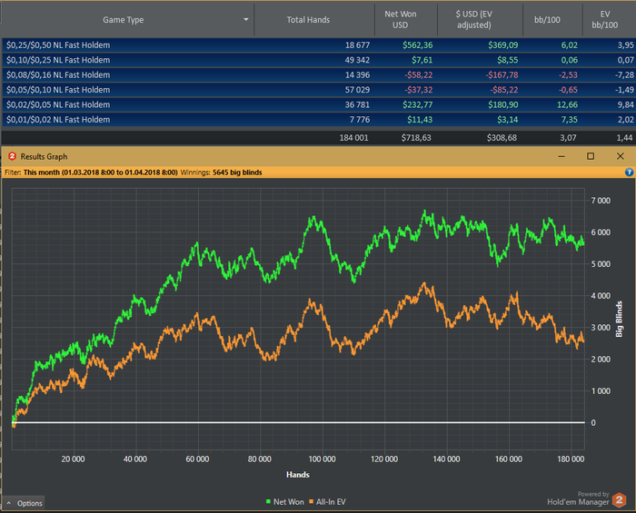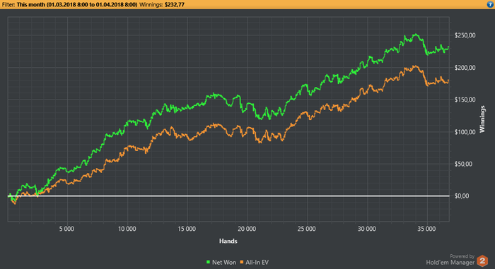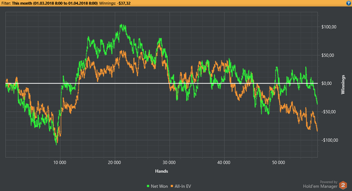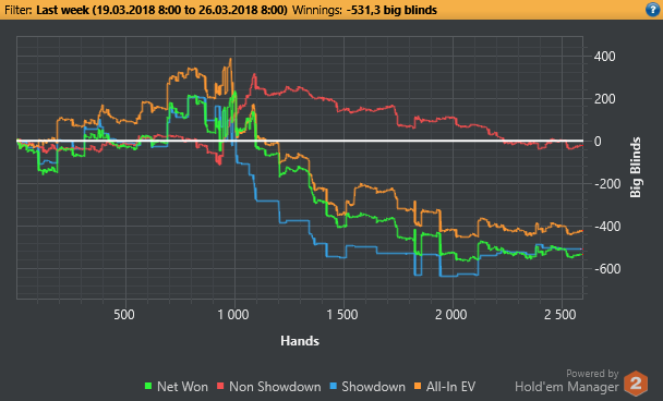 Правда здесь еще нет минус 150ти, которые я залил на 100ке вечером: стек с КК в АА, и еще на полстека устроил колдаун, т.к. имеется (скорее всего ложное) ощущение, что на сотке люди только и делают, что блефуют.