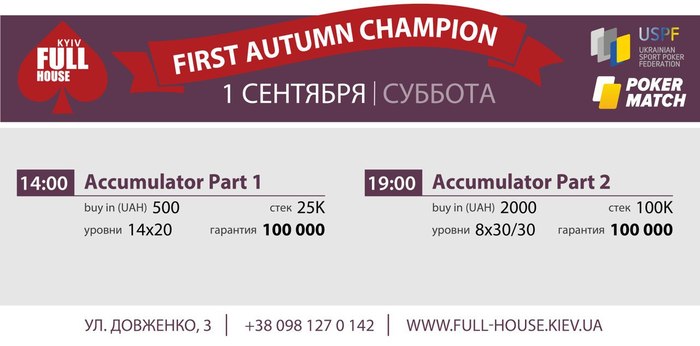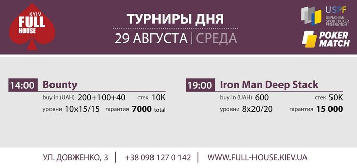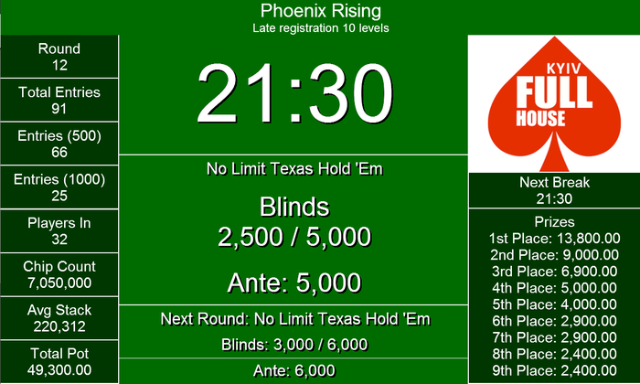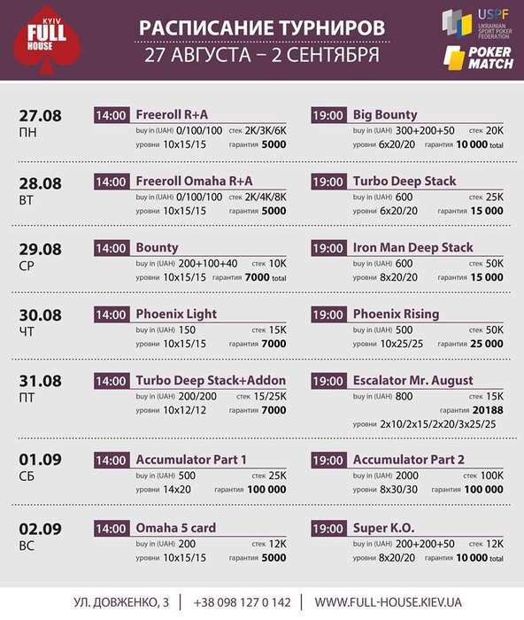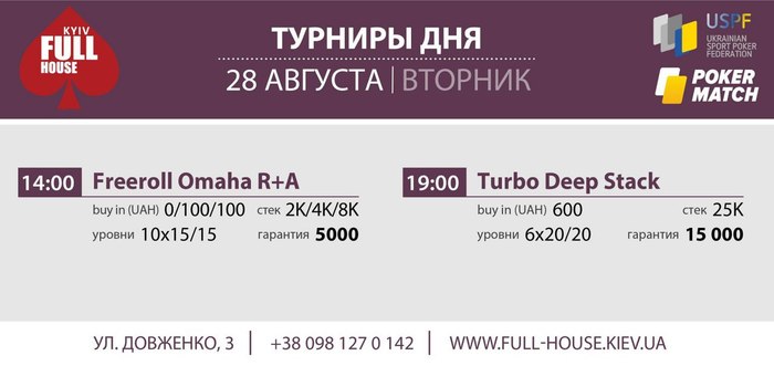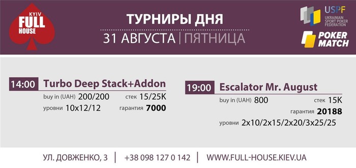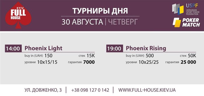 Завершена поздняя регистрация в турнире "PHOENIX RISING", и снова гарантированый призовой фонд в 25 000 был перебит практически в 2 раза, размер призовых составил 49300, борьбу за которые продолжает 31 спортсмен! Данный формат турниров уже давно зарекомендовал с лучшей стороны! Но, дамы и господа, 2 турнира за день и 2 раза гарантия перебита в 2 раза! Поглядим что будет в понедельник, ведь 1 сентября останется позади и у вас появится больше времени для любимой игры, а вместе с этим и призовые устремятся в небеса. Ну а завтра ждем всех в гости на заключительные турниры августа. Не стоит расслабляться, ведь эта турнирная неделя еще не окончена! Впереди много интересного, особенно турнир "ACCUMULATOR" с гарантированым призовым фондом 100 000! Всем Удачи, и помните: FULL HOUSE - ВСЕГДА БОЛЬШЕ ЧЕМ ПОКЕР (wink)