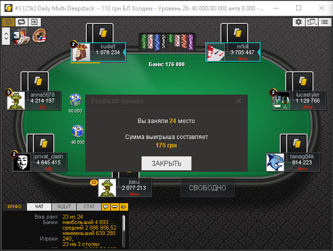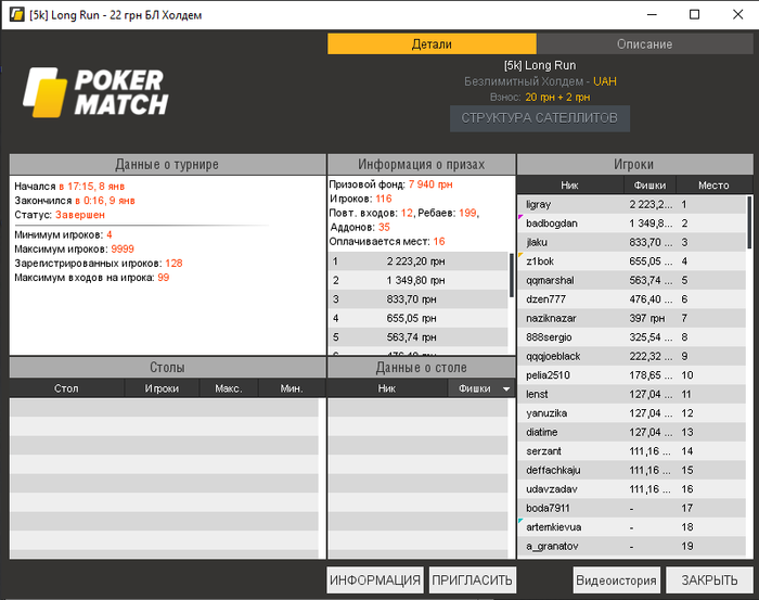 Но это было в конце сессии первого дня камбека, 8.01. А по началу и ближе к концу все было не так радужно и это мягко говоря. Как и в прошлый раз я решил не "мусолить карты", а врываться сразу, агрессивно, надеясь на голод к игре после перерыва и бесконечных рабочих смен во время которых накапливал ауру наматывая километры на огромном складе)). Но я не успел и моргнуть, как за окном было темно, в кассе осталось 100 с мелочью гривен, даже побывав до этого на финалке и заняв третье место, но всего лишь в карапузике и открытых столов осталось всего да ничего... При этом не было ни дальних проходов, ни хороших стеков, да и действительно интересных турниров, помимо Long Runner, который я в итоге и занес и кстати говоря в который сомневался залетать или нет! А вообще я довольно таки смутно помню по очередность всего из-за боли в глазах и тумана в голове, то ли из-за того, что отвык сидеть часами у монитора, да еще и принимать по несколько решений в короткий отрезок времени, то ли из-за монитора купленного на днях с рук в Познани...Но мониторе позже! Так вот, в какой-то момент я словил себя на мысли, что играю не то, что без особого энтузиазма, а еще и на автопилоте, словно после не первого месяца рутинной катки и это меня одновременно и удивило и конечно же расстроило, ведь ожидалось, естественно все иначе, веселее, бодрее и плюсовее! Тот случай, когда уже понимаешь, что это провал и параллельно с оставшимися турнирами листаешь закладки с вакансиями... Нет, я не собирался уходить с работы из-за покера или даже благодаря ему в случае успеха, а уже давно решил сменить работу и подумал, что более полезно, да и менее стрессово будет заняться поиском и завтра уже начинать обзвон вакансий, ведь из-за слитого БР-а намечался свободный день. Но потом, понемногу, начала вырисовываться радужная картина в том самом турнире и когда предо мной уже не мелькали 6+ окон и понимание, что это последняя надежда и надо показать все, на что способен, я наконец-то начал играть, а не клацать мышью принимая примитивные решения, словно в любом случае чет затащу и по другому быть не может. Видимо где-то в сознании поселилась уверенность в успехе первого дня, т.к. последние разы непременно так и случалось, будь то в Украине, когда только начал марафон и в первый же день выиграл Карапузик, будь то уже Польша, когда по приезду быстро начал колотить топ 3 места и бр соответственно! В общем по итогу я собрался, нащупал свою игру и конечно же не без доли везения, но в целом очень уверенно выиграл турнир, причем начиная примерно с топ 20 постоянно доминировал и прессовал оппонентов как в старые добрые!