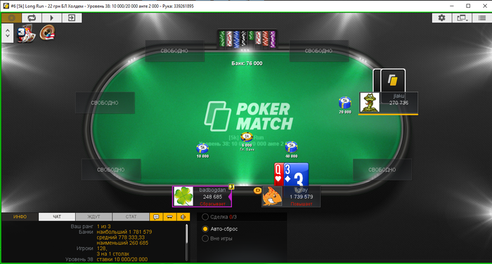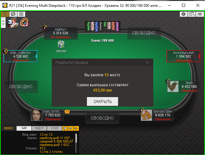 12 числа была суббота, казалось бы насыщенный день в плане турниров, но по всей видимости это был минусовый и довольно таки замазочный денек. Кстати в этот день я все же сыграл милионник, но сумел добыть лишь один билет вылетел быстро и соответственно без славно... Так же случился не доезд в самом дорогом для меня турнире после возвращения. Но самое интересное и в тоже время не приятное произошло в наверное самом любимом моем турнире по 110гр мульти дипстек 35К! Этот скрин я назвал: "знал расклад" и не с проста! Хотите верьте, хотите нет, но как только мне раздали пару 44 ( возможно даже до этого и это конечно совсем было бы фантастично, однако я не помню точно), но помню точно своим мысли: "Вот бы сейчас мы зарубились с чуваком на бб у которого стек немного меньше моего. Я с сб рейз, он кол, я попадаю в сет, а он в две пары, главное, что бы не стрит-флеш дро какое нибудь, что бы после выставления по флопу у меня не было мега стресса и все такое!)) И, вуа-ля! Вот только по мимо 2 пар у него по терну, по которому мы уже выставились, у него оказался еще и раннер флеш-дро, и я, едва успев пробормотать чет типа:"ну пожалуйста, не надо" начал наблюдать как огромное количество фишек едет к человеку, который помечен у меня фишом еще с того момента, как я плотно катал на ПМ радуясь заносам и сладким полям. Но хотел бы отметить, что я этого парня тут же пробил и понял, что инфа устарела и теперь мы поменялись местами. Нет, я не стал все же фишом (надеюсь), а он сильным регом, но профита у него в разы больше и он стабильно катает и заносит, в отличии от заграничного трудяги. Вот такая вот жизнь интересная штука!