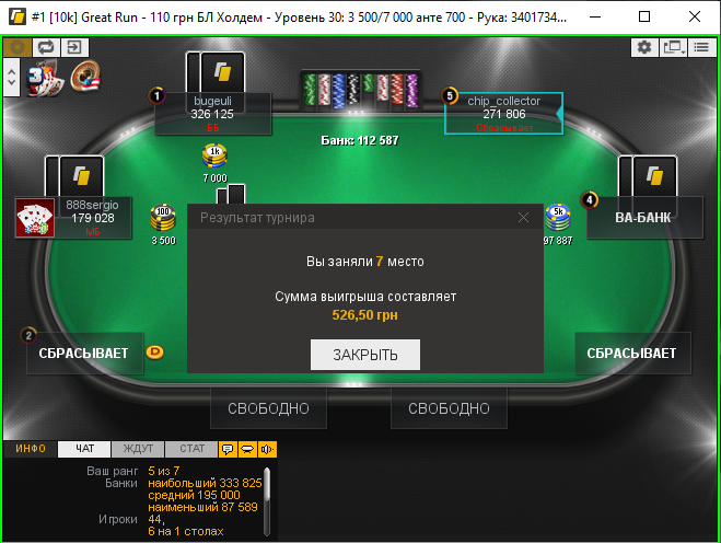 И так: После 2х дней катки бр составляет 2727гр и это +762гр Сказать, что очень доволен - нет, но и не расстроен, так как события разворачивались по разному и я мог писать (или вовсе забить) , что мой камбек провалился. Так что рад тому, как есть. Хотел уточнить, что средства я буду периодически выводить, т.к. сейчас с финансами очень напряжно и надеюсь, что вскоре перестану вытягивать деньги из покера, а то это будет слишком длинная история даже не смотря на благосклонность госпожи удачи, которую желаю и Вам!