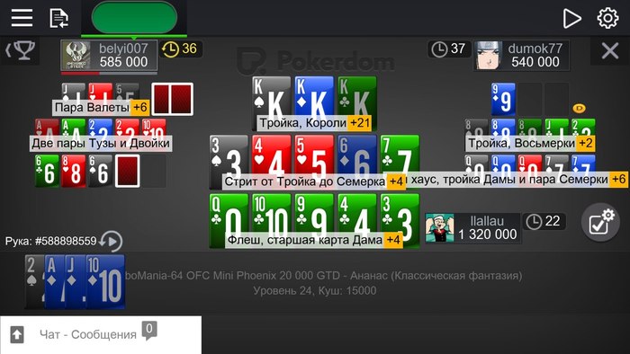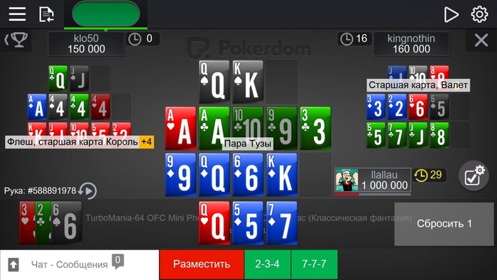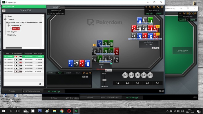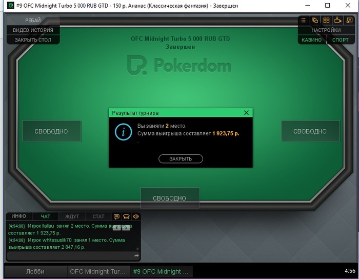 В последнее время на покер практически нет, закрыл 2 экзамена и сел покатать вечером 2 турнира, в 2nd chanse стал баббл-боем, т.к. безлимитная фантазия оппонент умудрился 6 раз подряд собрать фанту, обиднааааа. В миднайте вышел в ХА со стеком 500к, не купил несколько раз подряд фантазию и застрелился, после чего в равных стеках играли час ещё, потно, а опп походу не знает о существовании кнопки распила, поэтому пришлось бороться до конца, досидели до глубины стеков по 25 кушей у каждого и опп купил тузов наверх, как-то так