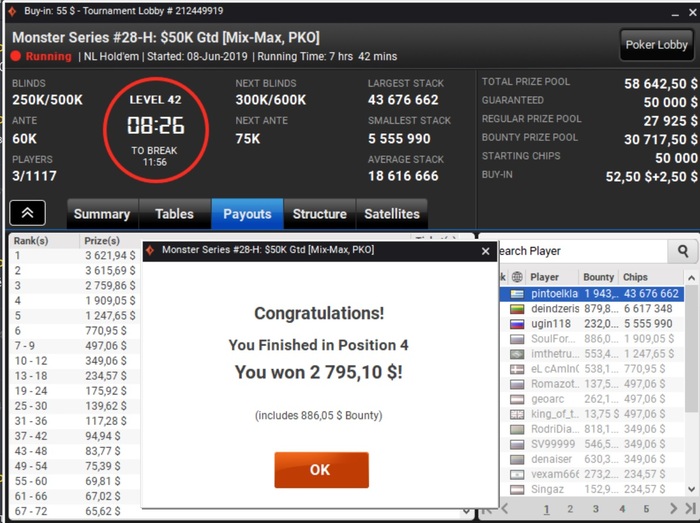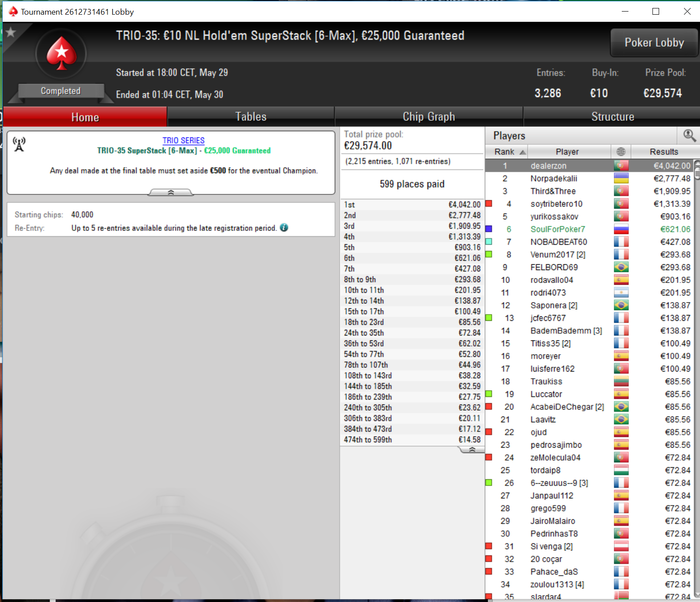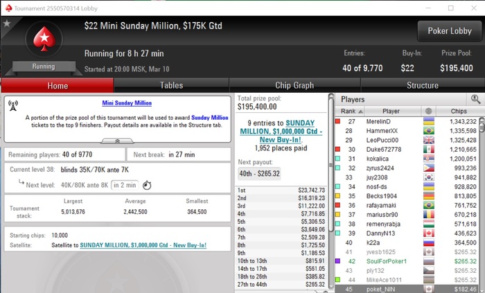 Давненько я в своём дневнике не появлялся Особых сдвигов пока нет, всё ещё насилую АБИ 10. Но уже чувствую себя увереннее на текущих лимитах, что не может не радовать. Хотел летом сгонять оффлайн покатать, видимо уже не сложится (ни времени нет, ни денег). В онлайне к основной загрузке подключил сети iPoker и WPN, пока прощупываю поле, вроде и там и там хорошее. На покеркинге впервые увидел настолько нелепые структуры в турнирах, поздняя рега по 5 часов, это что вообще такое ? Садишься такой в 22:30 и катаешь до 8 утра Из последнего интересного первый занос на айпокере