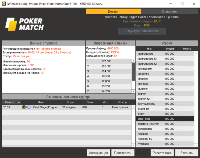 Поздравляем новых участников Главного события нашей серии, которые отобрались в онлайн-сателлите на PokerMatch В Прагу отправляются игроки с никами kvant_tot и land_seal!