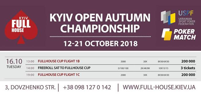 #FullHouseCupFlight1A До старта самого масштабного турнира серии FullHouse Cup остается всего 2 часа. Бай-ин ₴2000, стартовый стек 30 000 фишек, блайнды по 30 минут и 40 на финалке, которая пройдет в четверг, 18 октября.