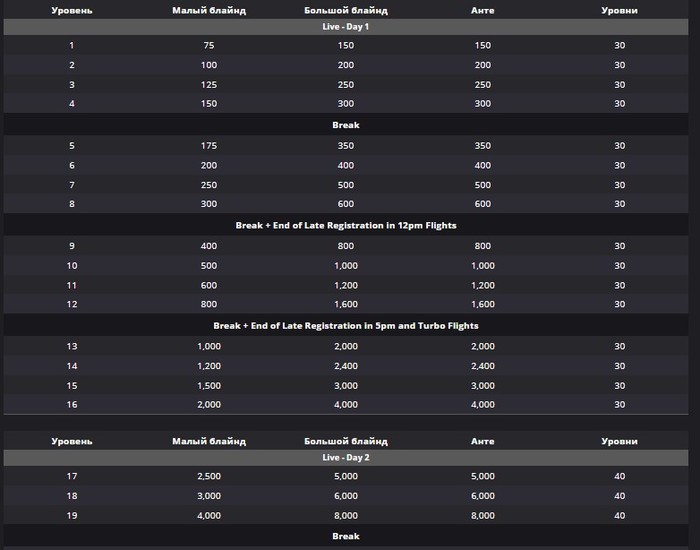 Онлайн день состоит из 16 уровней по 12 минут каждый. Вы начнёте игру со стеком 30,000 и с блайндов 75/150.