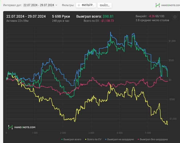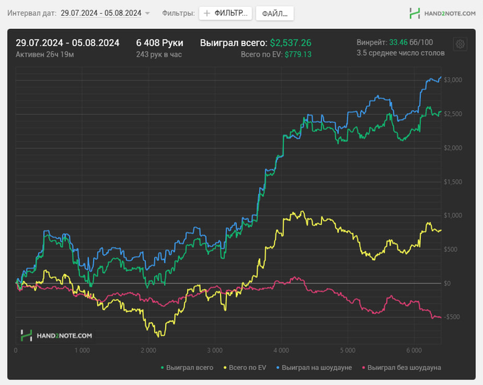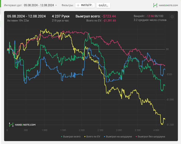 Отчёт за неделю, крайне недоволен как я закатал выходные, особенно воскресную катку, слил весь свой профит за неделю, ладно бы диспа шатала, так нет я сам виноват в части своего залива(300$ прям подарил сам), знаю что надо фолдить ривер и план был такой, потом открываю его статы и начинается та часть размышлений, вот совершенно лишняя, чем дольше думаешь тем хуже решение, звучит неадекватно, но думаю кто-то понимает о чем яИ после этой раздачи начались раздачи из серии похуй-кол-рейз....к ним подключились куллераИ Алёша с отвратительным чувствами, даже с неким отвращением к себе закончил неделю в 0.