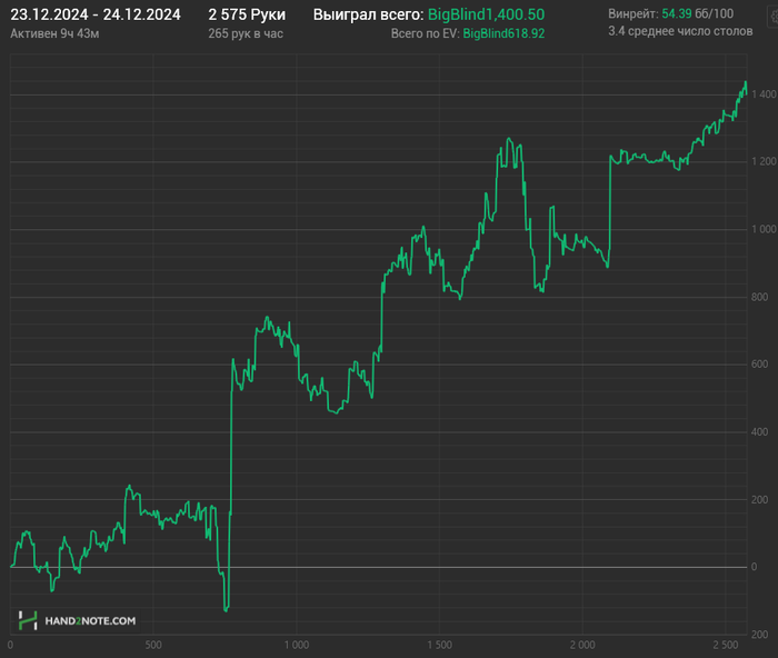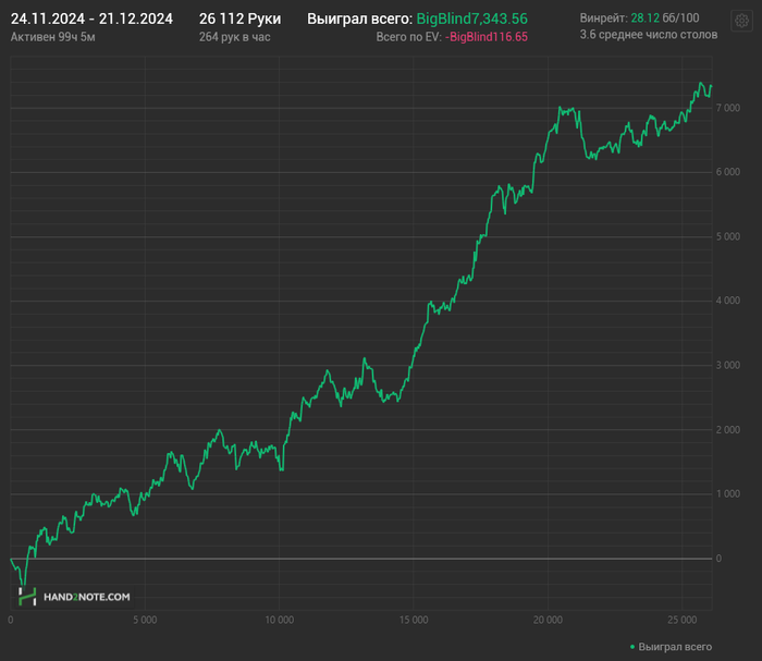 Сыграл уже стандартные 25 часов, надобно увеличить, но уже в график вошёл и не меняю в принципе его, режим катки-отдыха, пока устраивает, увеличить кол-во столов хз, пока до пяти столов мне катать комфортно, если 6 стол селектится уже не успеваю принимать решения, а автопилот нах нужен, дышим ровно.