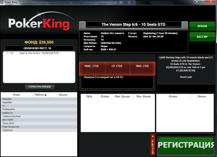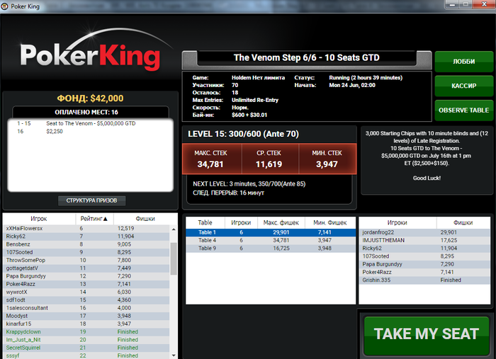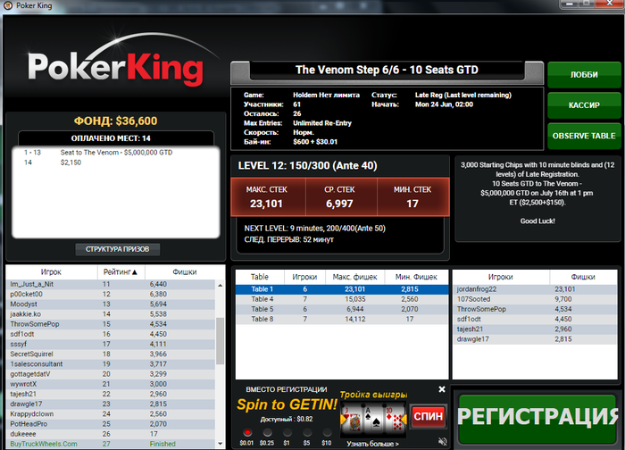 По началу заходил сразу.. Потом только на пуш фолд.. Ну без везения никак..