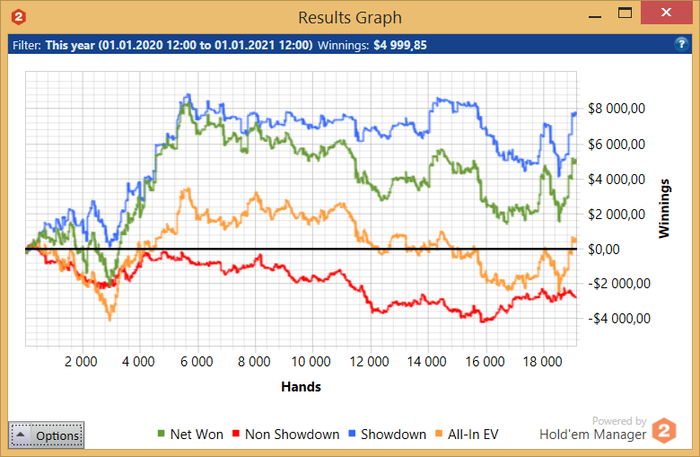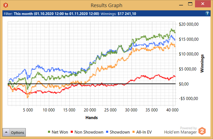 1к пока не радует - апстрика нет, оценить винрейт пока не могу, не думаю что прям совсем не гожусь, но и сильно уверен что винрейт должен быть хуже чем на лимитах ниже - некоторая разница определённо есть. Под хорошего фиша должен плюсовать, но вот проблема в том что таких фишей раз-два и обчёлся, да и сухих фишей 30/10 не сказать что много, да и всё равно под таких редко играю. Регварю пока редко, так что пытаюсь попасть за стол ручками, что мягко говоря непросто, но всё же удаётся с более-менее нормальной частотой, так что за 1.5 месяца я наиграл всего 4к рук в -1600 по ЕВ.