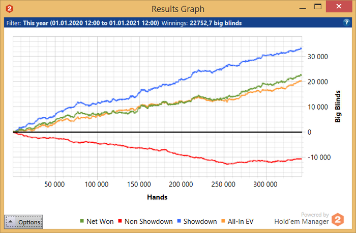 Вообще, по ощущению удовлетворённости от покера последние года 1.5 наверное превосходят всё предыдущее время вместе взятое, т.к. почти всегда было недовольство текущим уровнем в пищевой цепочке (именно им в первую очередь, а не доходами). Тут наверное ещё сказалась структура разделов блогов: что на стретеджи, что здесь выделен раздел нл400+, и именно уверенную игру на этих лимитах я всегда воспринимал как некое подтверждение профпригодности. Хотя я очень быстро поднялся на нл100 (и это время быстрого подъёма, я подозреваю что у очень многих, когда ты прям доволен собой и тем как всё складывается) но очень-очень надолго застопорился на нём (и казалось что возможно уже навсегда), а даже когда делал вылазки на лимиты выше - я не ощущал себя именно регуляром на них, скорее просто залётным бахтером, и было весьма неприятно осознавать, что спустя столько лет ты всё ещё рег нл100.