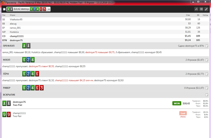 Сегодня видел флеш-рояль. жаль что не у себя.:) Слишком пассивно сыграл? No-Limit Hold'em, $0.10 BB (6 handed) - Converter Tool from http://www.flopturnriver.com/