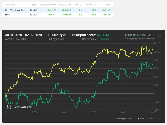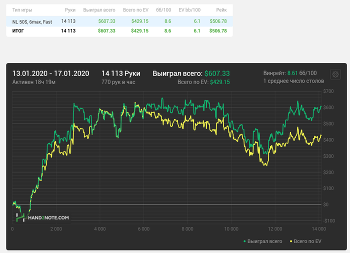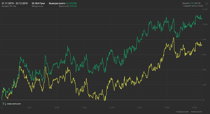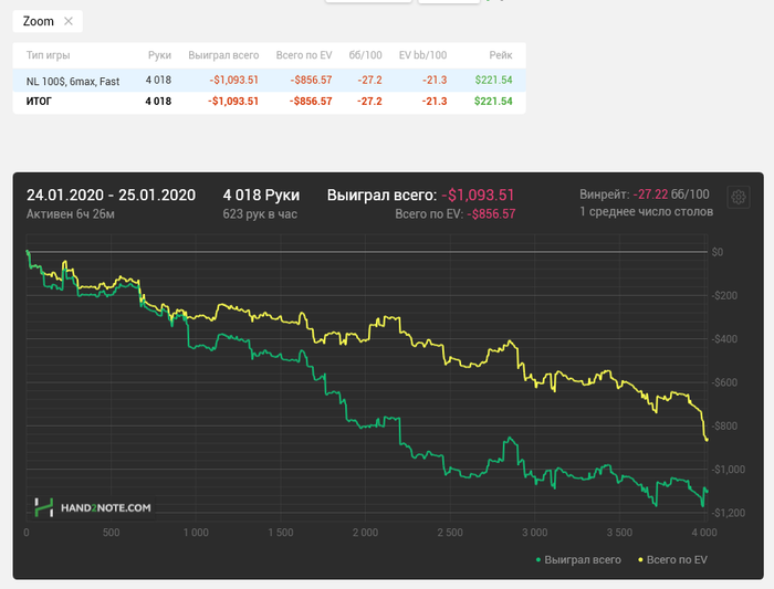 Выглядит очень странно, конечно) На графиках довольно интересные временные отрезки, было так: - начал играть с рег столов nl50 - решил добавить nl100 + пару румов (там точно такие же чуваки сидят) - понял, что на селект хороших столов уходит 70% времени + не все скриптеры еще перевелись, на 888 вообще невозможно с этим бороться - ушел играть z50 (2 стола) - заебал z50, начал стартовать столы nl50-nl100 сам - ФИШ ВСЕГДА САДИТСЯ СЛЕВА ОТ МЕНЯ БЛЯТЬ КАКОГО ХУЯ?? - ушел играть z50 (3 стола) - добавил 3+ часа в солвере каждый день (на графике начиная с 16-17к рук зума) - решил попробовать z100 (2 стола) - на z100 быстро дали пизды, -$450 за 1к рук - ушел играть z50 (4 стола) - еще немного поиграл z100 (уже не так страшно)