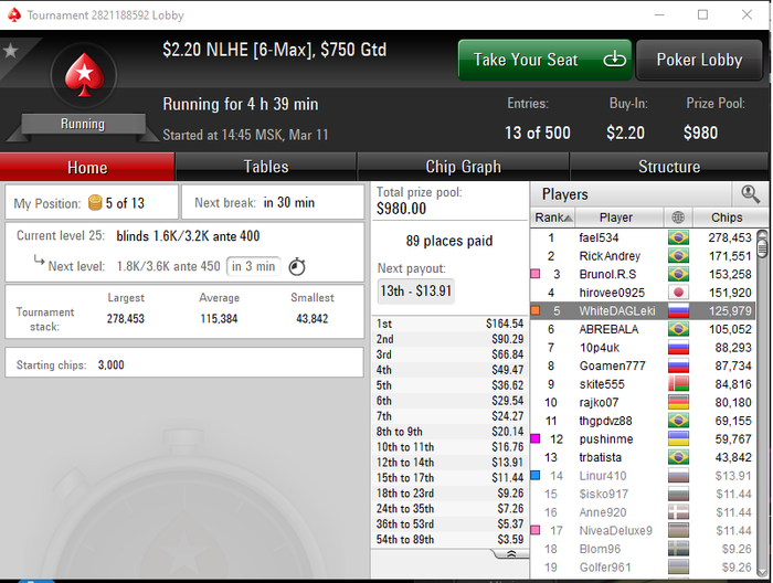 15-25 числа Марта выдались психологически сложными, но я разобрался со всем гавном в голове которые влияли на игру... было несколько дележек в хендзапе в мою пользу , помимо этого еще штук 8 финалок 5-9 мест ну в конце месяца 2-3 дня было много проходов в килополянах но тоже увы. Не растраиваемся т.к уже моя игра мне нравиться и победа будет вот вот... Например на память вчера 30 место в биге за 4 из 6к народу, до этого 40 мест в килополяне за 11 и т.д Ну обидный недоезд в турбо билдердаймонд за 33 в который я прыгнул случайно реально случайно тыкнул, это уже 3 раз при попытке зарегаться в бб за 3.3 , вообщем вернемся к турике , начало было норм держал свой стек на начальном уровне 5к забирай блайнды , но под конец 30 минуты раздают КК где я под автоолын забираю еще двух парней в итоге утроение и +3 кнока .. В итоге за первый час я сделал +100 кноками. второй час прошел очень тихо было несколько сомнительных ситуаций где я не стал откалывать 20бб+ стеки и в итоге досидев до предфиналки вылетел 11 заработав в общей сложности 180$+/