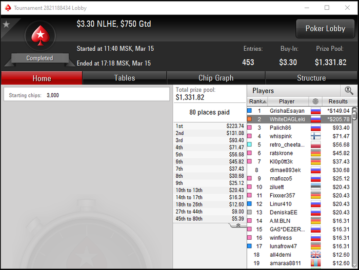 02.04 Супер начало месяца , начался с хорошего настроения и настроя на игру пакет не купили но я не отчаялся )) Загрузился сегодня 37 турниров, загрузка шла 6 часов ... Была дальний проход в турике за 11 баксов, не помню какое место вроде вылетел на предфиналке 95$ , была финалка в билдере даймонд за 3.3 , 5 или 6 место , баксов 60 вроде получил, ну и новый турик за 5.5 кнок , где впринципе шел неплохой весь турик имея всю дорогу 100бб стек. Сел за финалку с 60 баксов кнок и восемью слабыми игроками включая меня ) В итоге дошел до топ 3 где шел 3-им имея стек 40бб вторым шел парень с 50бб и чипак с 80бб , чет я так приуныл что не мог никого выбить что решили с ними делить, чувствуя что вот вот вылечу уже... В итоге поделили и решили разыграть кноки.. Чипак был слабый и отлетел впринципе через раздач 10 , не от меня ( дефолт ) ну и в хендзапе я собрался и забрал чутарик кноков . В итоге хорошее настроение и первое место + 540$ за сегодня учитывая что загрузка была на 200$