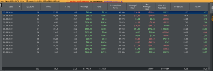 3.03.20 - 15.03.20 отиграл 332 турнира за две недели, в шоке что не было отдыха за это время, но помню играл на отьебись очень часто буду отдыхать сегодня-завтра , иначе чувствую что играю пошла на спад, игру ухудшилась понравилась фраза "нахуй посредственность" Реально надо любить игру, либо ничего не получиться ( пулчиться посредственный результат )