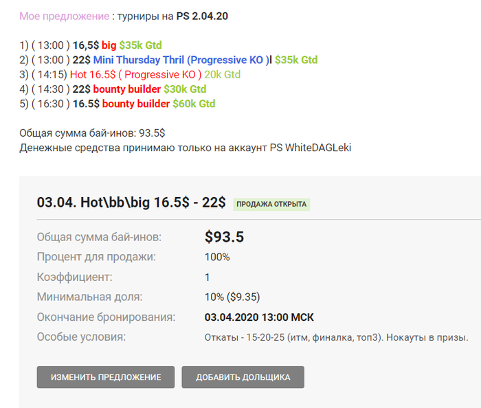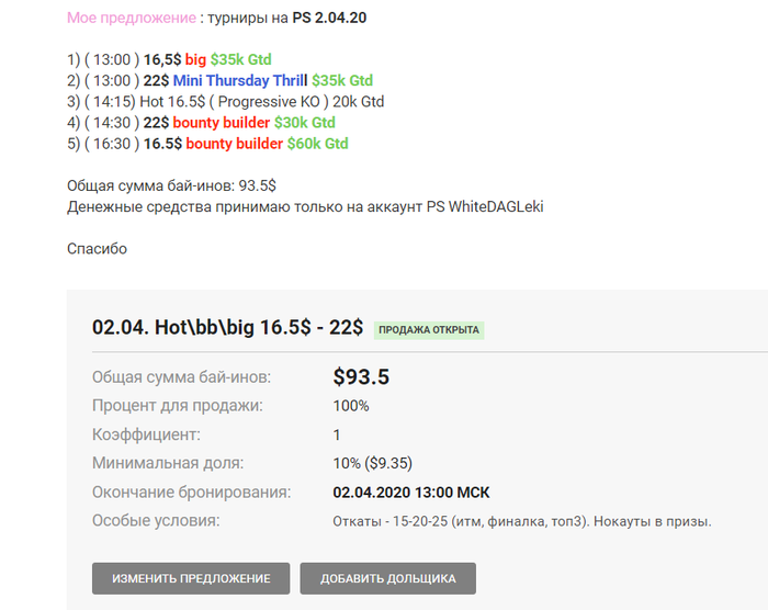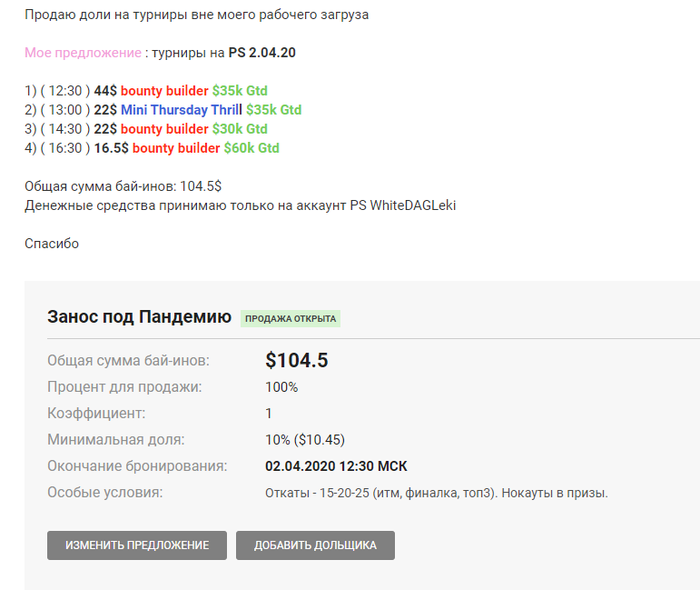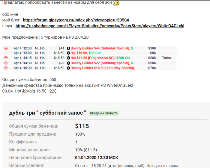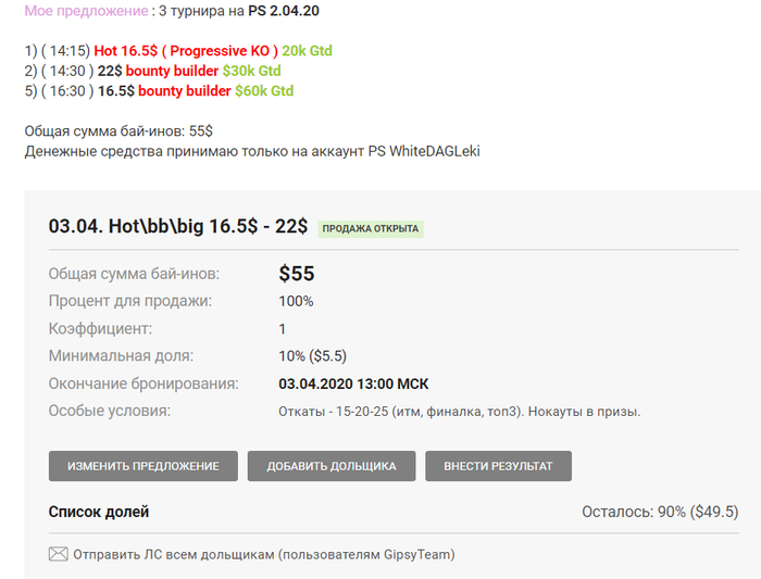 Очень интересный момент с продажей долей конечно , улабыает меня дико ) Там типы скупают пакеты от минусовых "регов" или у кого призовые не достигают 2к профита в общем продаю доли на 3 турика кому интересно пишите https://forum.gipsyteam.ru/backing/topic?tid=140685#stakeFormBlock