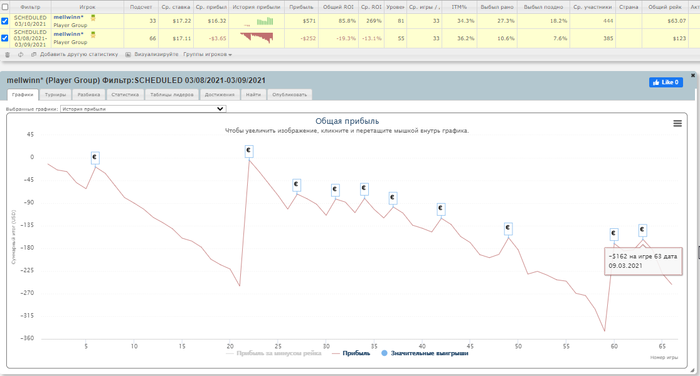 Друзья, привет! Для начала скажу, что сегодня выложили результаты летучки, по итогам которой я узнал, что нахожусь на 9 ранге. Так что бьем новые рекорды или повторяем их. Хотя не знаю какие рекорды в ФФ по ростам, но то что каждый месяц я поднимаюсь по рангам, это радует, т.е. не стоим на месте, развиваемся. Дальше будет сложнее в этом плане. Но вот что я хотел сказать, какая же интересная штука МТТ. Катал 8 и 9 марта обычную свою загрузку, возили меня лицом по асфальту, сколько же выслушали от меня мои соперники, ну или Румы, ну или ГСЧ, соседи тоже наверно слышали:). Винрейт по ЕВ бил рекорды, а вот по факту получал шиш с маком, что конечно отражалось в денежном выражении. Вот как это выглядит:
