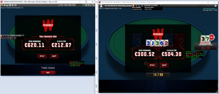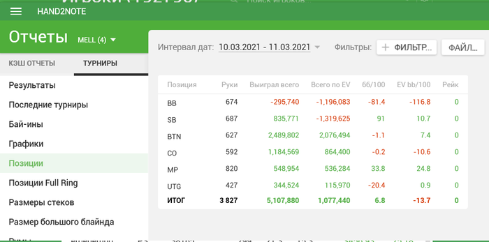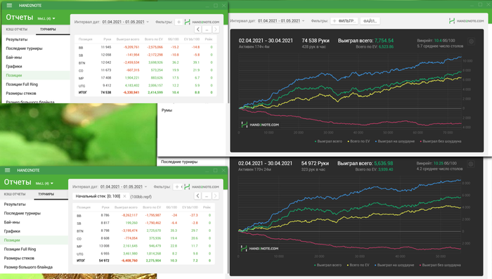 3. сыграно в общей сложности около 760 турниров на ГГ, ПС.ком, ПС.ес, Винамакс, 888, и Пати. Основные румы для катки: ГГ, ПС.ком, ПС.ес и Винамакс. Чтобы катать на 6 румах одновременно нужно улучшать "машину", что будет одной из последующих целей на ближайшие 3 месяца. 4. винрейты: 18,3 бб/100 и 14,41 евбб/100.