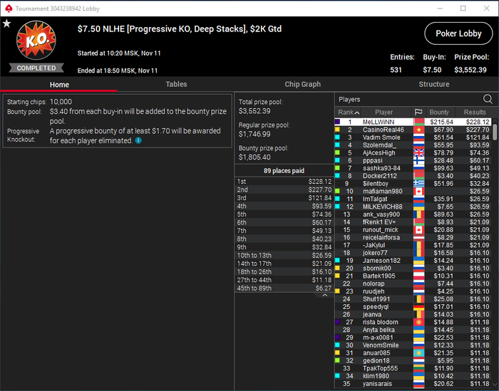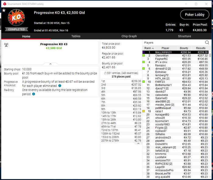 Ну а вчера все было наоборот ЕВбб пробил дно, факт - так себе, вылетал рано в каждом 4 турнире, за то оформил 4 финалки, два топ 1, 1-топ 2 и так по мелочи. Пусть призы и не большие, в дневной загрузке они обычно и не бывают большими, но факт остается фактом: