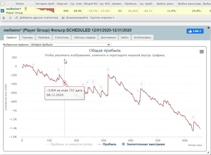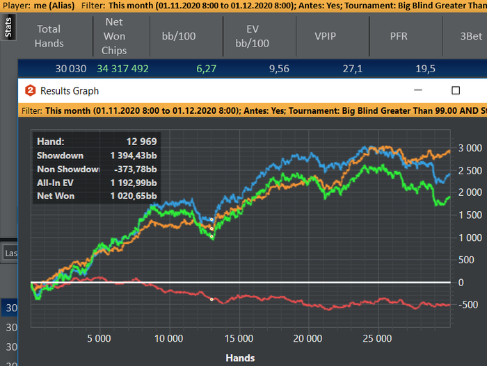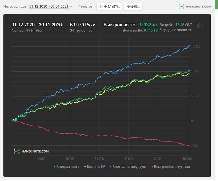 Итак, подведем итоги декабря месяца: в целом, как это бывает после переапа идет спад, что произошло и со мной: -сыграл в общей сложности за месяц 660 турниров на АБИ 10 с отрицательным роем в 13%, тотал профитом минус 1400$ . Винреты: без фильтра 16,5 бб/100 и 15,5 евбб/100, с фильтром 6,9 бб/100 и 5,6 евбб/100(первую половина месяца вообще минусовый был винрет, хотя без фильтра был в районе 20 бб/100, во второй половине пошло в верх). В общем ощущения были таковы, что мне не складывалось в лейтах ну вообще, лишь небольшие заносы были мной зафиксированы.