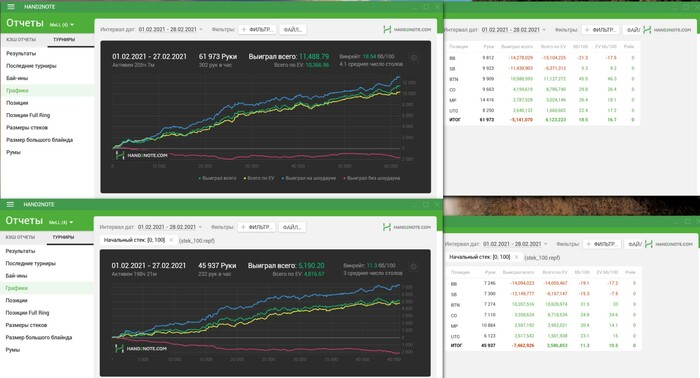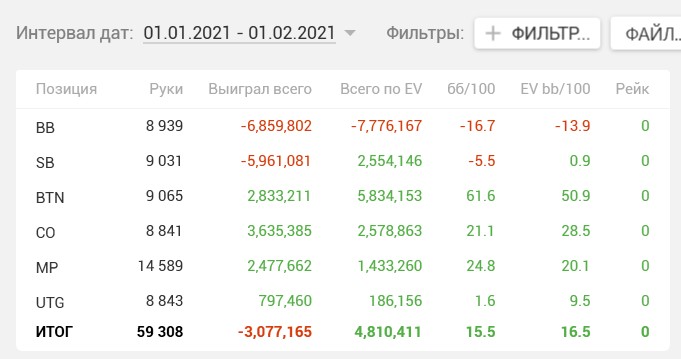 Винрейты: 15,5бб/100 и 16,5евбб/100. С фильтром 7,8бб/100 и 8,5евбб/100. Фильтр с января месяца используется другой, просто смотрят винрейты в 100ББ минус.