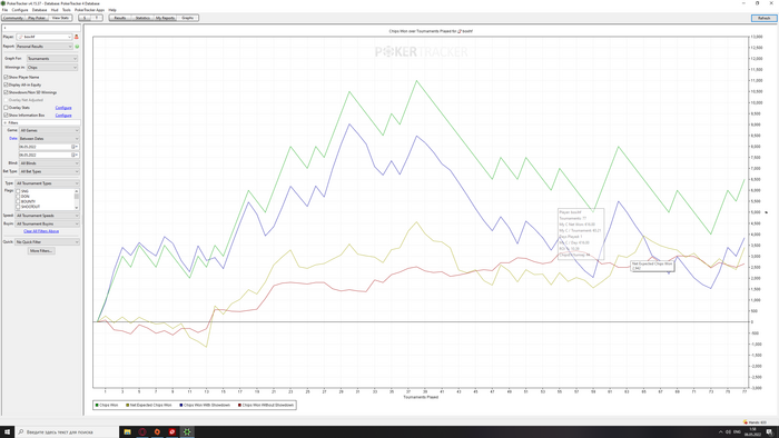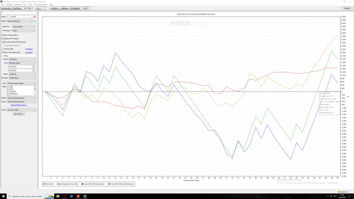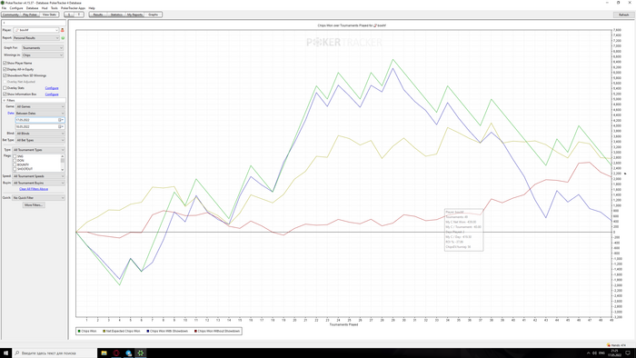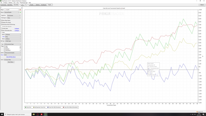 Сыграно 50 турниров. Пока что иду в мини минус -4, чип ев 70.