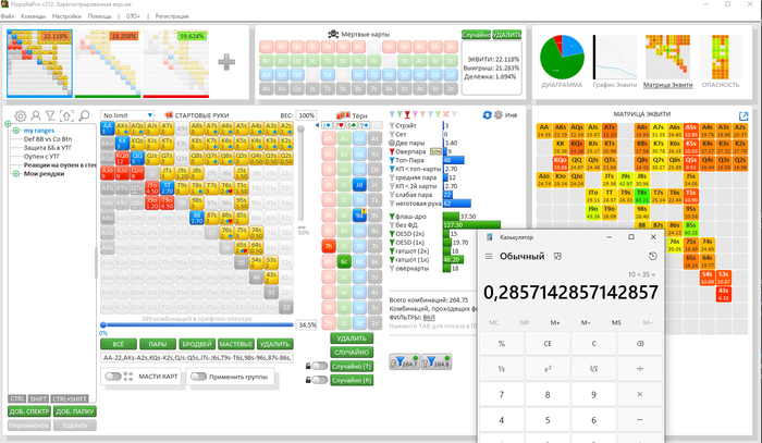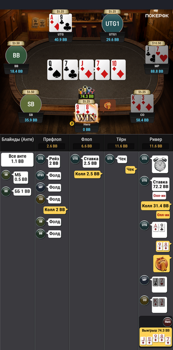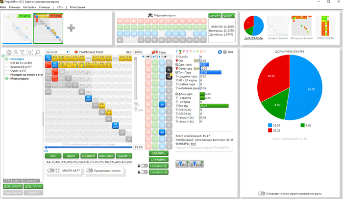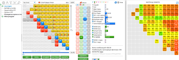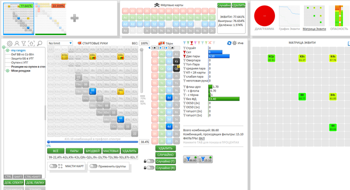Была интересная раздача я был уверен в своем действии по терну, но на всякий случай глянул в ФЗ сколько эквити у той или иной руки и как действовать на месте оппонента.