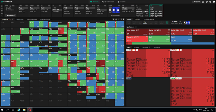 Сыграли данный спот почти по гто) Хотя цель у нас играть в эксплоит(использовать слабости оппов, а не баланс линий) но много полезного можно почерпнуть у солвера. Наша рука находится в диапазоне чек рейза - выбор сайзинга это уже наша прерогатива и зная что опп смешен на флопе в сторону велью, мы должны его рейзить большим сайзом.