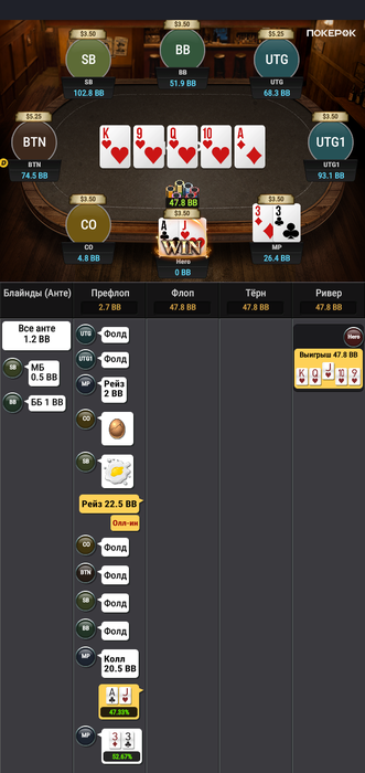 Сегодня вот такая была раздача, где я в процессе полагал, что у меня супер велью, сейчас понял что надо было ставить около 70% и выкидывать на пуш.