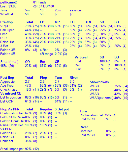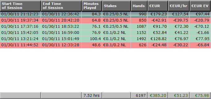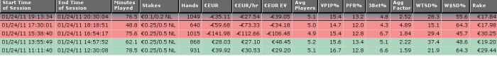 Заметил что довольно часто в середине рабочего дня, напрочь теряю концетрацию, отключай мозг и начинаю творить. Что мягко говоря не лучшим образом сказывается на винрейте. Например вчерашний день. Первые сессии с утра: Как видно, - всё отлично. Спокойный нитовый покер и ничего не предвещает беды. И потом я начал творить: