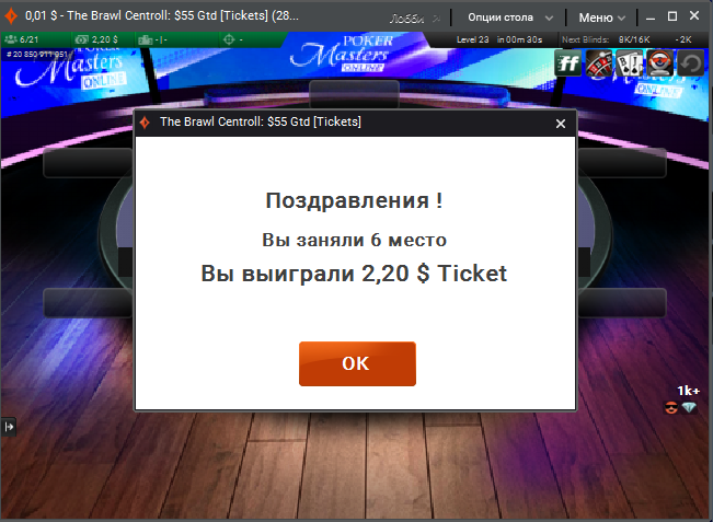 Всем доброе утро! НУ что же врываемся! Вчера забыл дописать все таки полусон дает о себе знать. Из выигранного билета я вчера зашел в турнир но получилось как обычно через жопу
